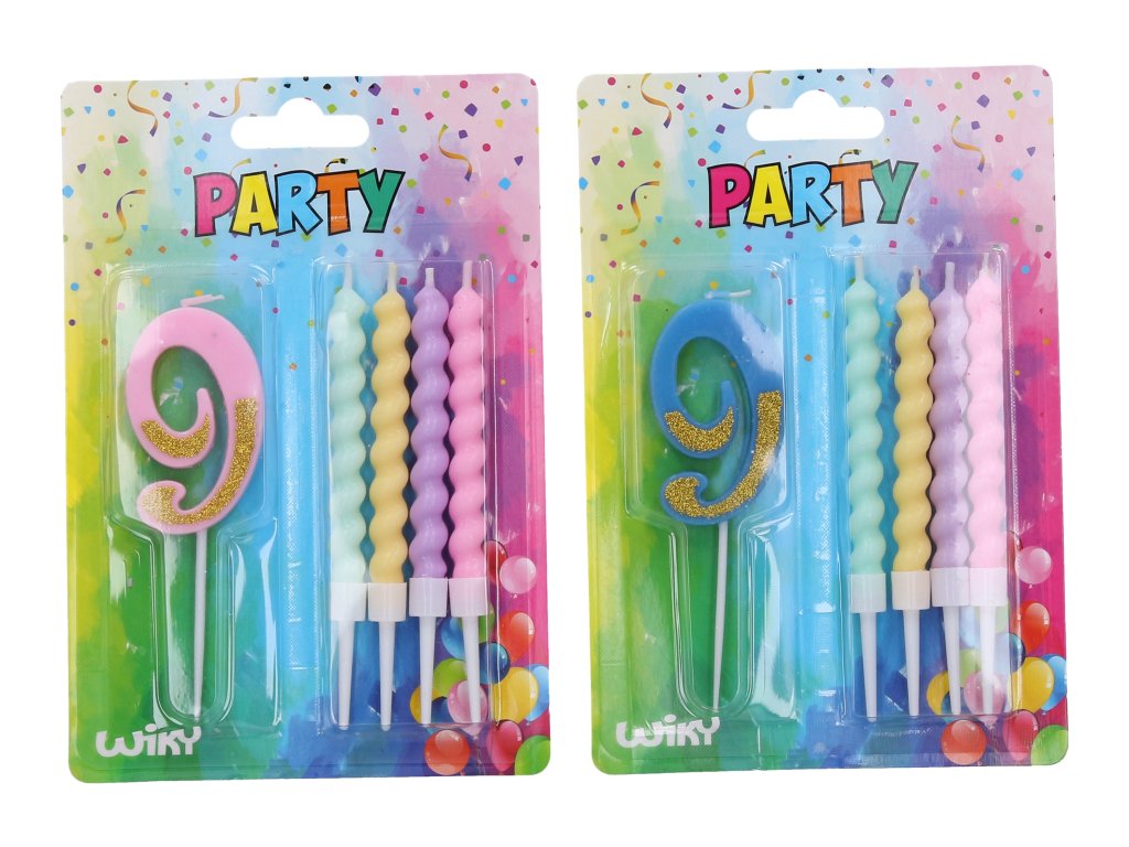 Párty sviečka číslo 9 + 4ks sviečok. 2 farebné varianty - modrá, ružováDodatočné parametre