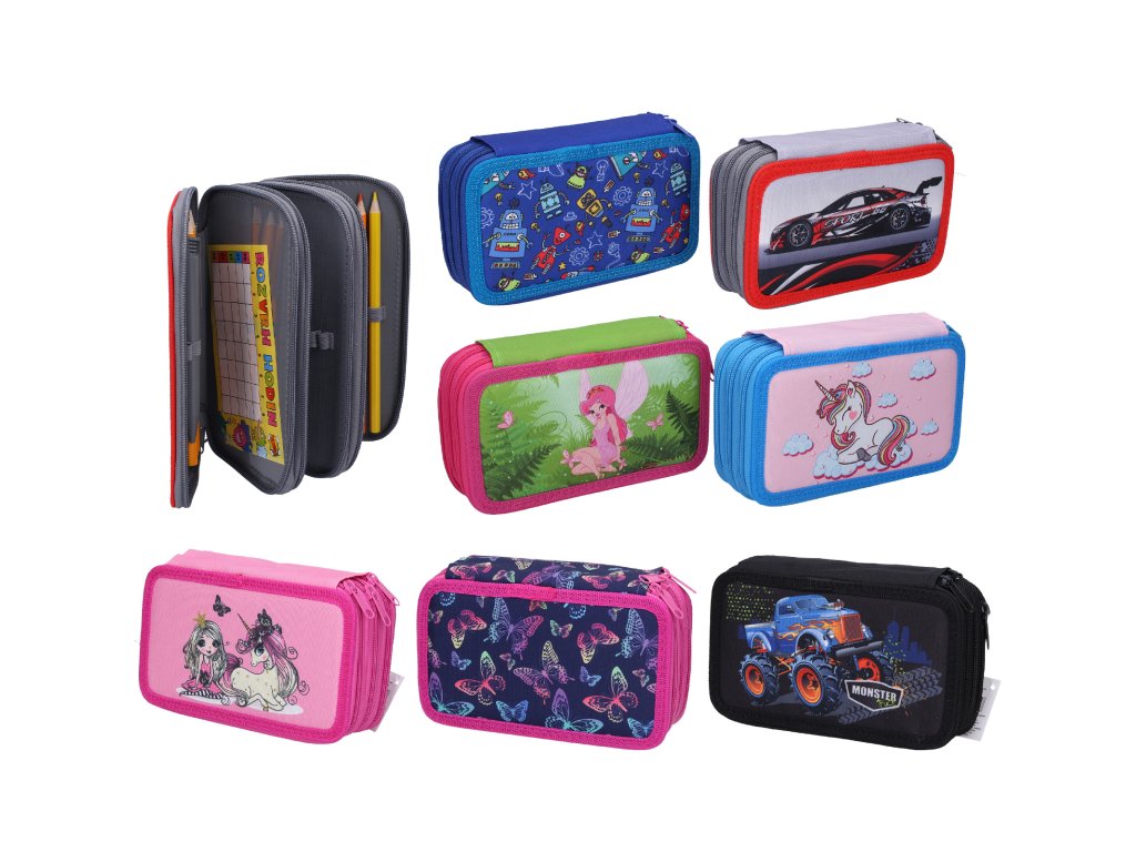 Trojposchodový peračník s výbavou je určený pre žiakov základnej školy. Každé jednotlivé poschodie sa uzatvára na samostatný zips. Puzdro má pružné gumové pútka na uloženie písacích potrieb. Školský peračník obsahuje základné písacie pomôcky. Rozmery: 19,5 x12 cmDodatočné parametre
