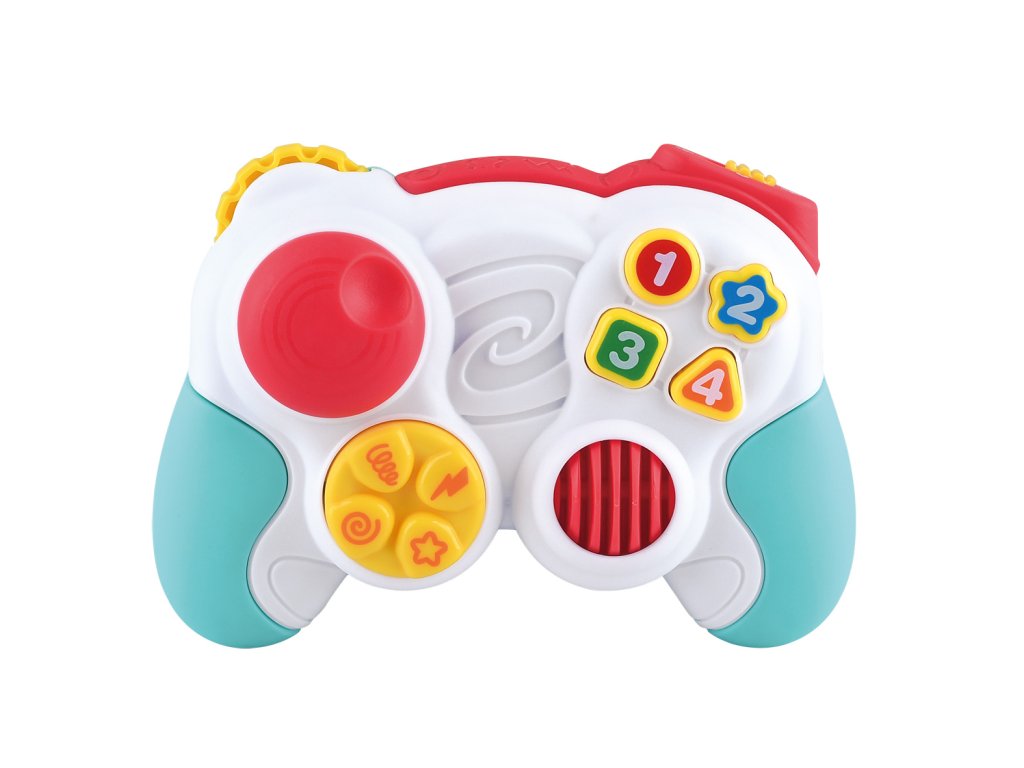 Gamepad s efektmi. Rozmery 14,5x5,5x10,5 cm. Zvukové efekty. 2xAAA batérie súčasťou. Prepínač vľavo nižšia hlasitosť, uprostred vypnuté, vpravo vyššia hlasitosť. Joystick a 4 tlačidlá so zvukovými efektmi, cvakajúce otočné kolieskoDodatočné parametre