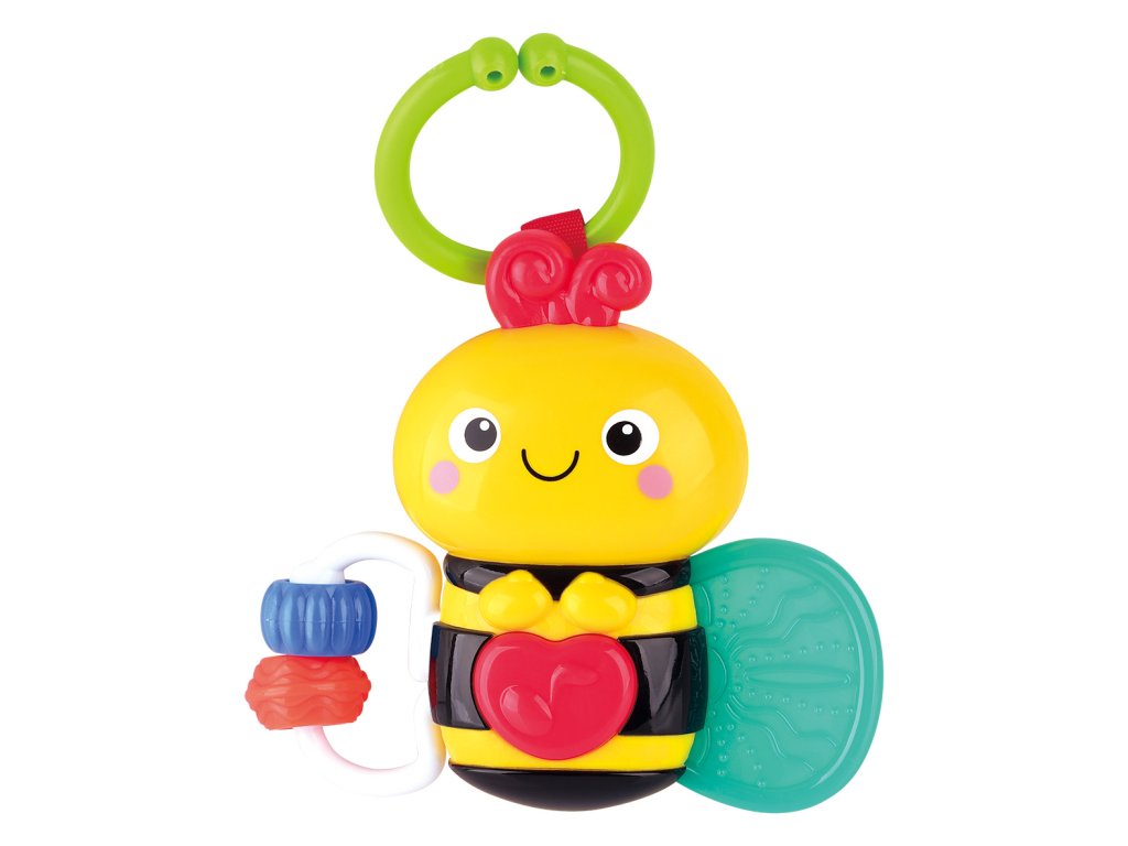 Včela s efektmi. Rozmery 14x4,5x16 cm. Svetelné a zvukové efekty stlačením srdiečka na brušku. 2xAAA batérie súčasťou. Dva krúžky na pohyblivom škrípajúcom krídle, hryzátko na druhom krídle.Dodatočné parametre