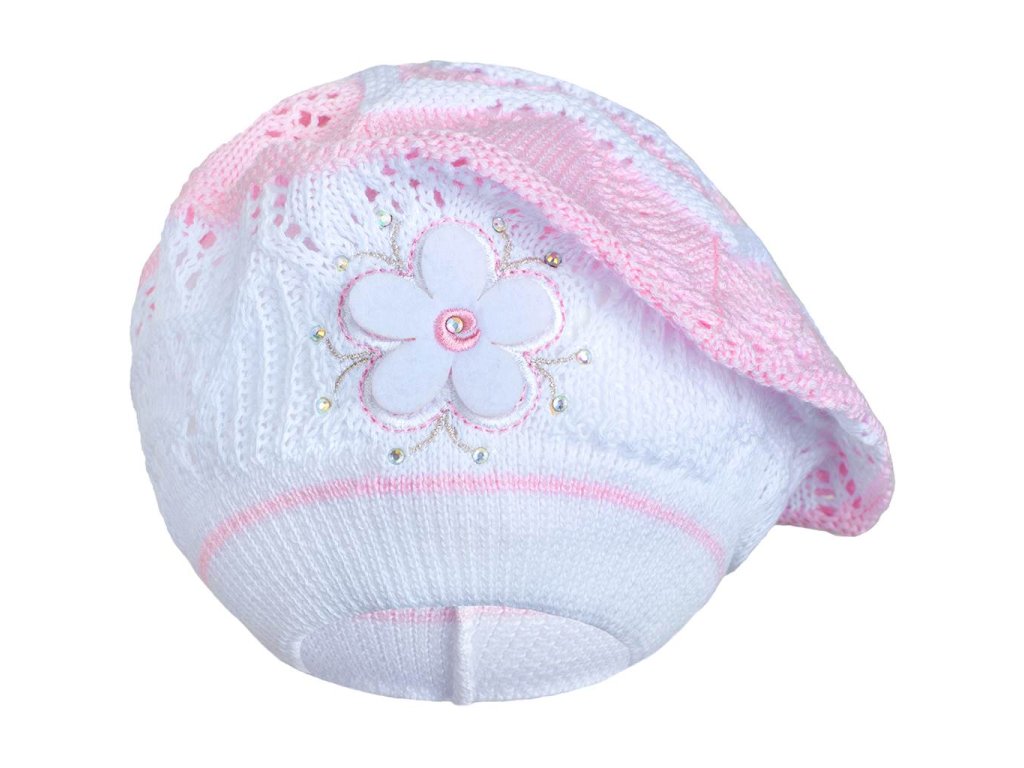 Jarná pletená čiapočka-baret New Baby. Čiapočku zdobí obrázok kvietky a veľká hviezdička v kontrastnej farbe. Čiapočka je ušitá z priedušného materiálu, preto je vhodná na jarné aj jesenné dni. Zloženie: 100% bavlna. Materiál je pružný. Obvod okolo hlavičky cca 40-50 cm.Dodatočné parametre