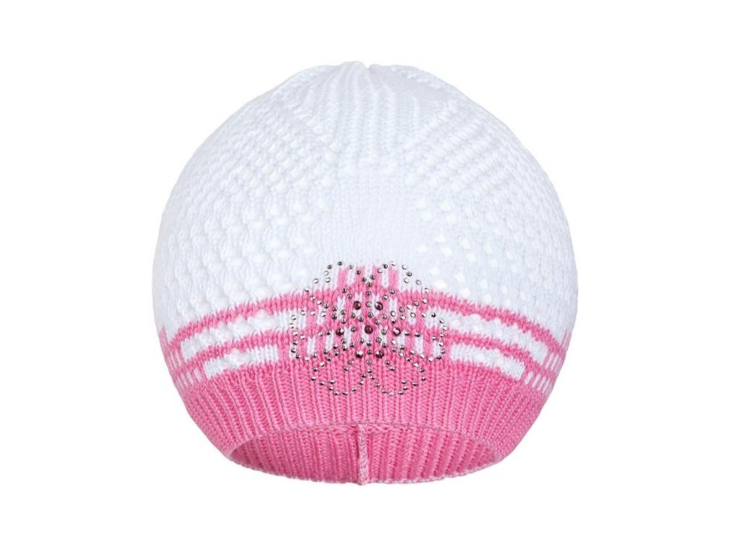 Jarná pletená čiapočka New Baby. Čiapočku zdobí obrázok kvietky, ktorý je ozdobený trblietavými kamienkami. Čiapočka je ušitá z priedušného materiálu, preto je vhodná na jarné aj jesenné dni. Zloženie: 100% bavlna. Materiál je pružný. Obvod okolo hlavičky cca 40-50 cm.Dodatočné parametre