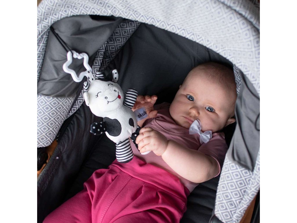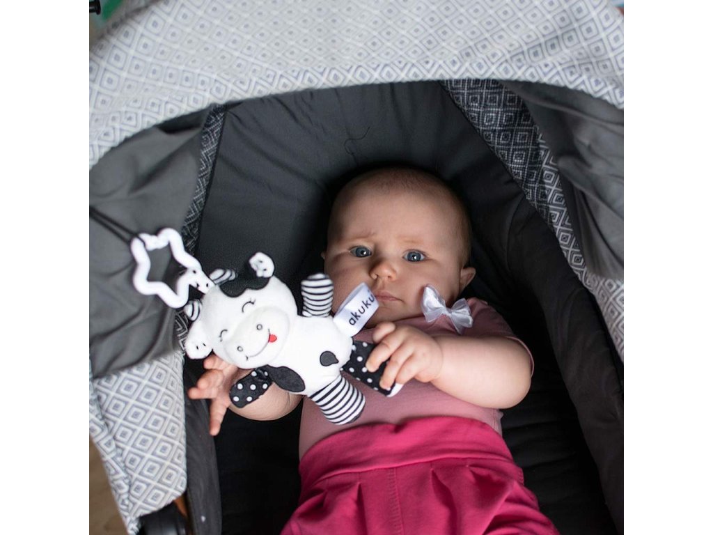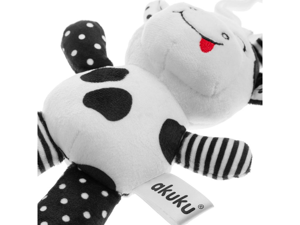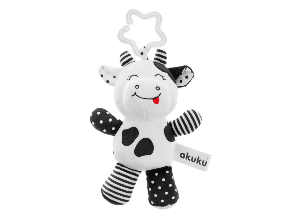 Plyšová hračka s hrkálkou Akuku kravička čiernobiela