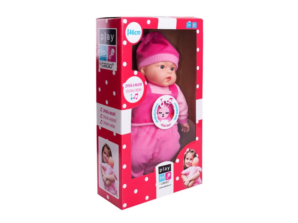 Krásna detská bábika PlayTo. Skvelá hračka pre každé dievčatko. Hlava, ruky a nohy sú vyrobené z gumy, telíčko potom z mäkkého materiálu, vďaka čomu sa môže dieťa k bábike krásne pritúliť. Bábika má celú sadu oblečenia, vrátane topánočiek a čiapočky. Oblečenie je možné zložiť a vyprať. Bábika má krásnu, usmievavú tvár, farebné oči a riasy ako u živého bábätka. Dĺžka bábiky 46 cm. Bábika má poľský modul a hovorí tieto poľské vety: mamusiu, tatusiu, tatusiu weź mnie na rączki, mamusiu kocham cię. Bábika spieva tieto poľské pesničky: Jadą jadą misie, Kosi kosi łapci, Miała baba koguta, Tá Dorotka, My jesteśmy krasnoludki. Modul je napájaný 3 guľatými batériami 1,5V (AG13,LR44-guľaté), testovacie batérie sú súčasťou balenia. Rozmery krabice: vxšvh: 47x28x12 cm. Vhodné pre deti od 3 rokov.Dodatočné parametre