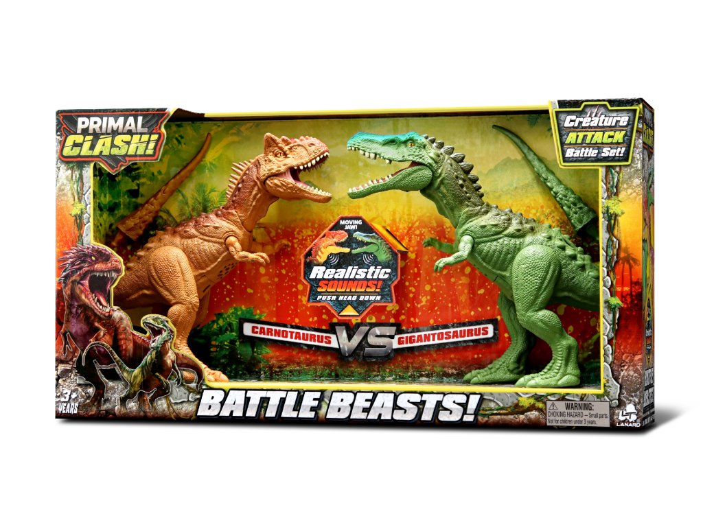 Primal Clash! Dino bitka set Carnotaurus VS Gigantosaurus. Výška figúrok dinosaurov je 21 cm. Pohyblivá hlava a čeľusť, zvukové efekty - aktivácia sklopením hlavy dinosaura. Balenie obsahuje 2 dinosaurami. Každý dinosaurus - 3xAG13 batérie, súčasťou balenia (celkom 6xAG13).Dodatočné parametre
