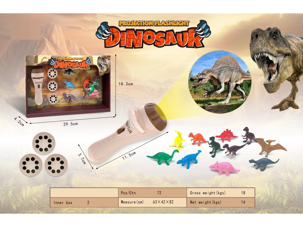 Projektor 24 snímok so zvieratkami - Dino. Obsahuje projektor, 3 kotúče so snímkami (celkom 24 snímok), 12 figúrok dinosaurov. Dĺžka projektora 11,5 cm, veľkosť dinosaurov 5 - 6 cm. 3xAG13 batérie do projektora súčasťou. Prepínač ON/OFF na projektore. Zaostrovací prstenec na projektore.Dodatočné parametre