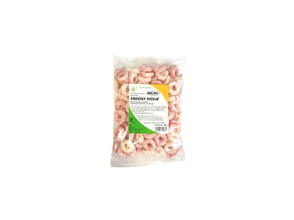 Krehká extrudovaná pochúťka. Krúžky ryžové v poleve s jogurtovou príchuťou s malinami. Vyrobené z bezlepkových surovín.