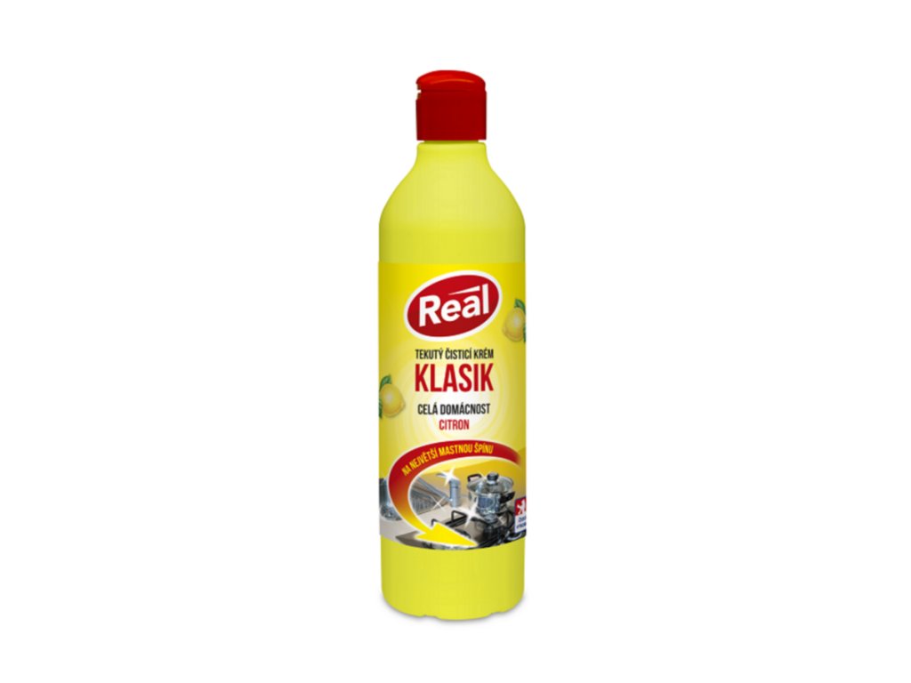 Čistiaci prostriedok Real Klasik je spojením čistiaceho prášku a jemného krému . Je univerzálna a využitie nájde v celej domácnosti. Je ideálny do kúpeľne, kuchyne aj dielne na tvrdé umývateľné povrchy. Ľahko umyje aj silné znečistenie, zaschnutú špinu a pripáleniny. Vďaka jeho vysokej účinnosti vám ušetrí čas aj sily. Má jemnú levanduľovú vôňu, ktorá nedráždi. Prostriedok nie je vhodný na lakované a plastické povrchy.