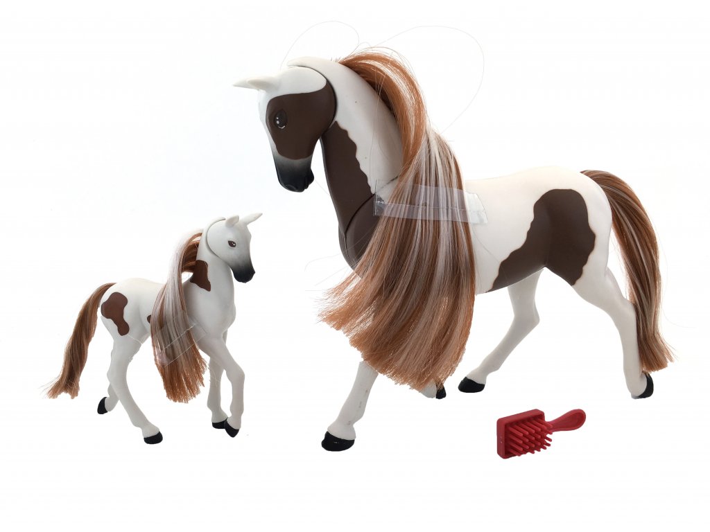 Žriebätko má svoju mamičku veľmi rado. Vždy keď sa k nemu nakloní dá jej pusinku. Súčasťou balenia je jablko, mrkva a kefa na rozčesanie ich krásnej hrivy. Veľkosť koní: 18 a 11 cmDodatočné parametre