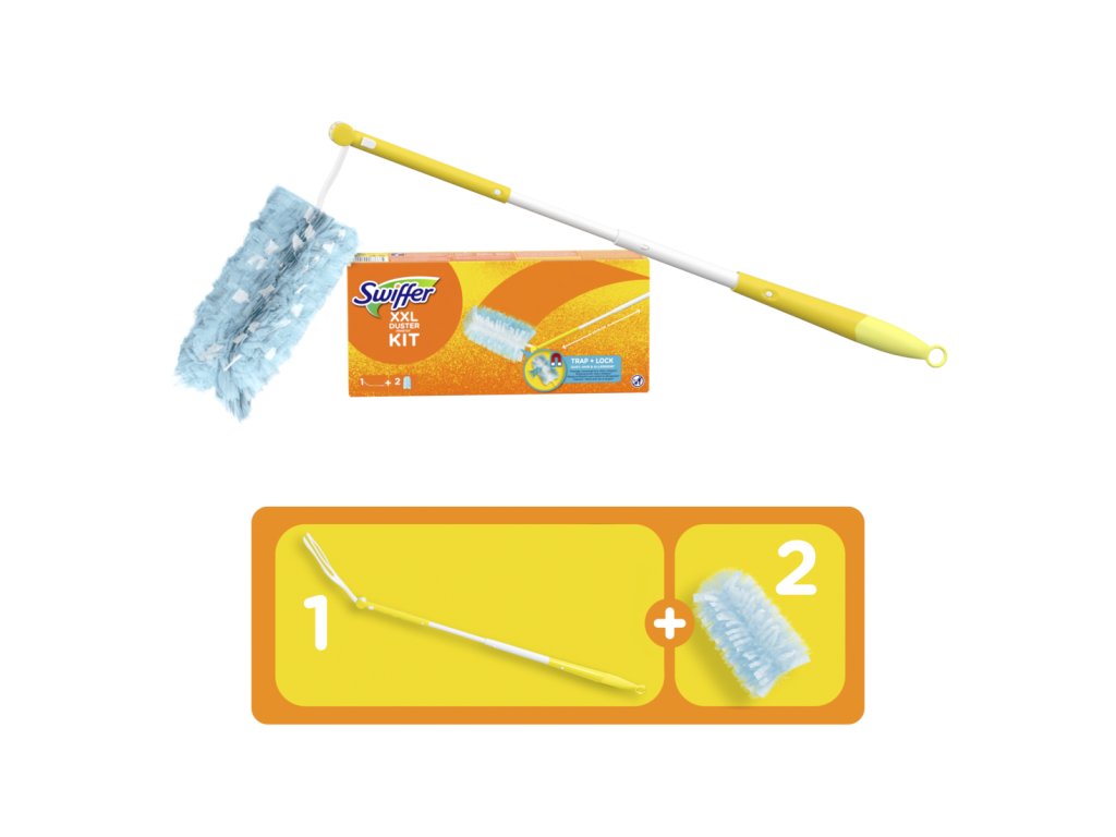 Rozlúčte sa s prachom, nečistotami, vlasmi a chlpmi na podlahe. Prachovky Swiffer XXL slúžia na zachytenie prachu, vlasov a alergénov z roztočov, ale aj mačacích a psích chlpov z povrchov, a to pomocou tisícov jemných povrchovo upravených vlákien. Prachovku Swiffer XXL je možné predĺžiť až na 90 cm, aby dosiahla aj na vysoké miesta a do úzkych priestorov. Poskytuje oveľa dôkladnejšie upratovanie ako iné prachovky. Teleskopická prachovka má otočnú hlavicu, ktorá ponúka štyri rôzne uzamykateľné polohy na čistenie kútov drevených podláh, nábytku, rohov skríň, podlahových líšt atď. Dosiahne aj do tých najťažšie dostupných miest, ako sú radiátory, rolety, prístrojové dosky áut alebo elektronika… Prachovky Swif vyrobené z jedinečných vlákien, ktoré sa tvarovo adaptujú zákutím a trhlinám, kam prenikajú a všetky povrchy tak zbavujú prachu, vlasov a chlpov bez vírenia prachu a nečistôt. Tipy pre vás: sú obzvlášť vhodné na odstraňovanie chlpov z neustále pútajúcich domácich maznáčikov a pre osoby trpiace alergiou na prach. Fungujú tak dobre, že vás možno začne baviť utierať prach. Prachovky Swiffer používajte spolu s násadou Swiffer®.