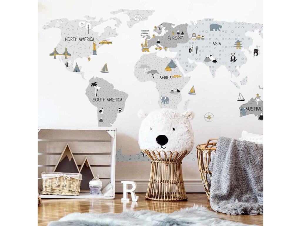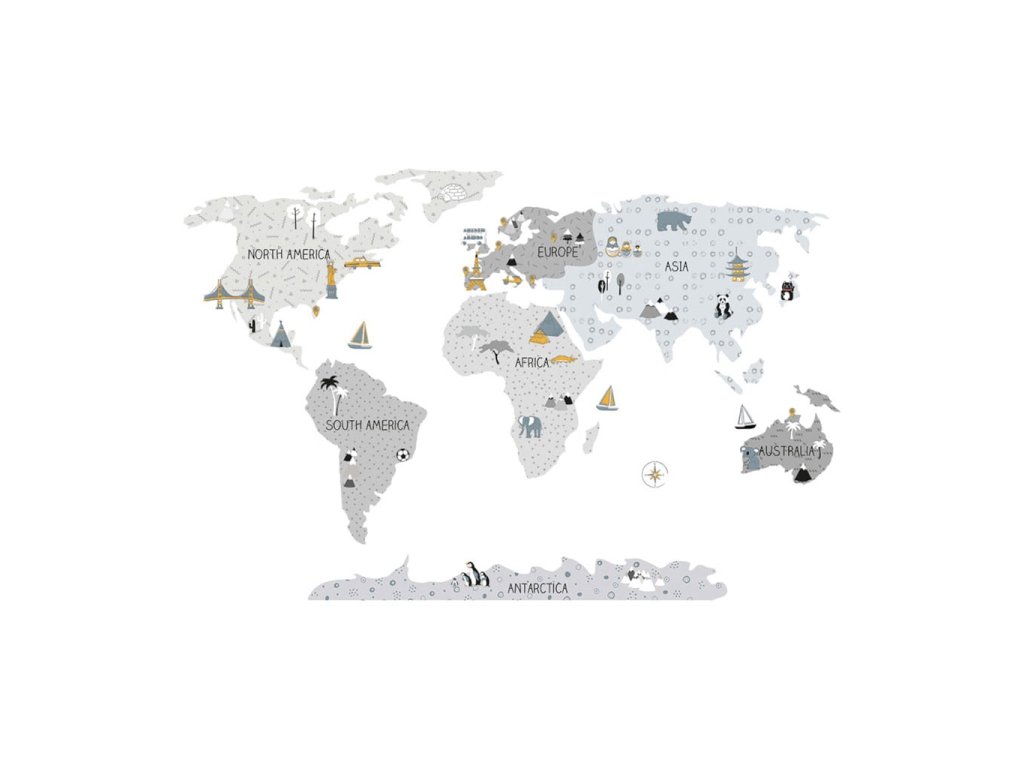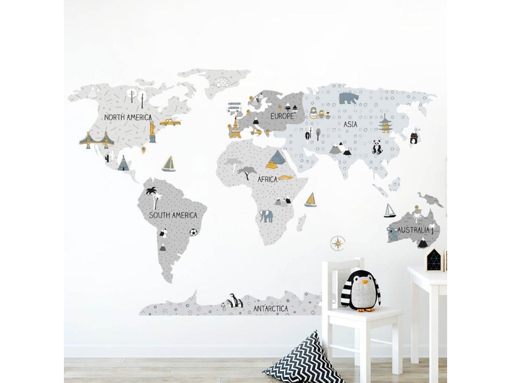Krásna nálepka na stenu Mapa S. Šedé mapy sveta sú produkty najvyššej kvality, vyrobené s maximálnou starostlivosťou a pozornosťou k detailom, udržované v tlmených škandinávskych farbách, ktoré dokonale zapadnú do priestoru dieťaťa. Mapy sú nielen jedinečnou dekoráciou, ale aj senzačným spôsobom učenia hrou. Deti spoznávajú kontinenty, oceány a svetové strany, ale aj pamiatky a zaujímavosti daného regiónu či štátu. Každý prvok mapy je starostlivo vyrezaný z obrysu a nalepený samostatne, čo uľahčuje aplikáciu, najmä v prípade veľkých priestorov. Veľkosť samolepky sa meria po jej aplikácii na stenu, pričom kontinenty sú od seba v patričnej vzdialenosti. Samolepka je zaistená špeciálnym matným laminátom, ktorý ju chráni pred poškriabaním pri každodennom používaní a zároveň uľahčuje lepenie – fólia je silnejšia a ľahšie sa prenáša na stenu. Ak hľadáte dokonalý spôsob, ako oživiť detskú izbičku, naše samolepky na stenu sú tou správnou voľbou. Objednajte si ich ešte dnes a urobte radosť svojmu dieťaťu.Táto sada obsahuje: