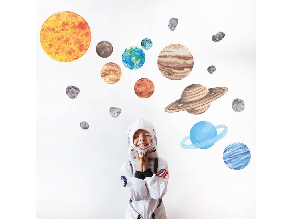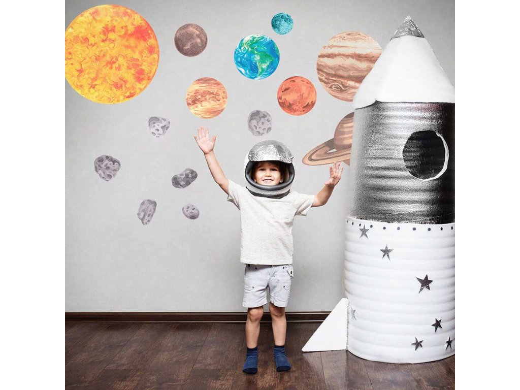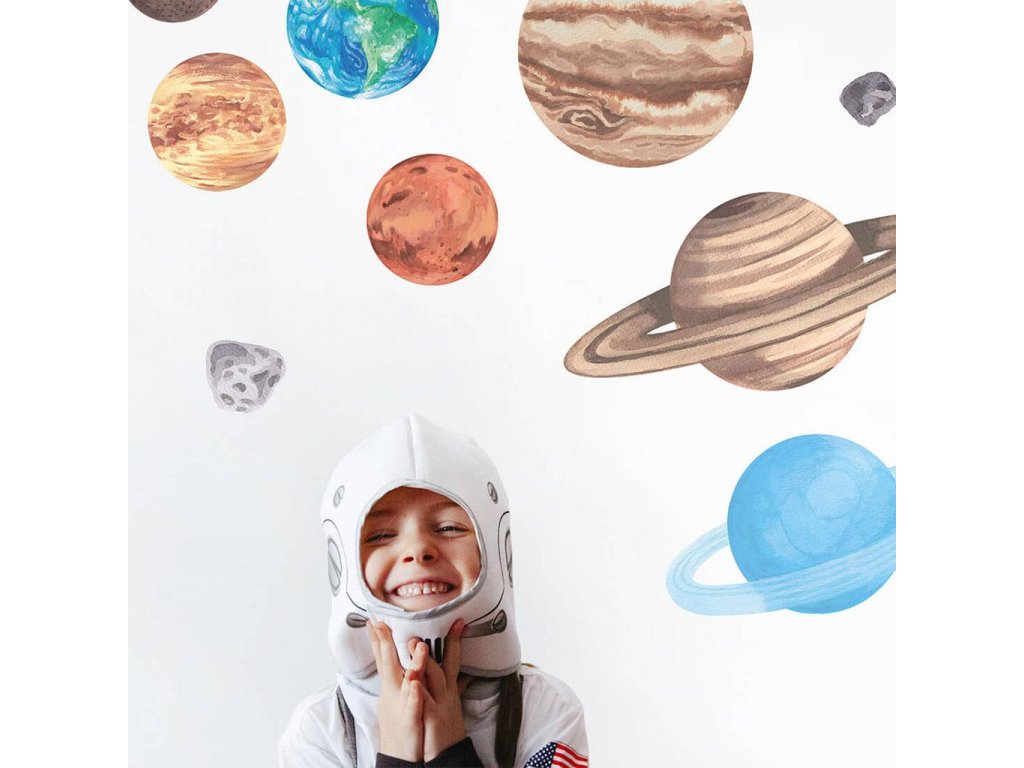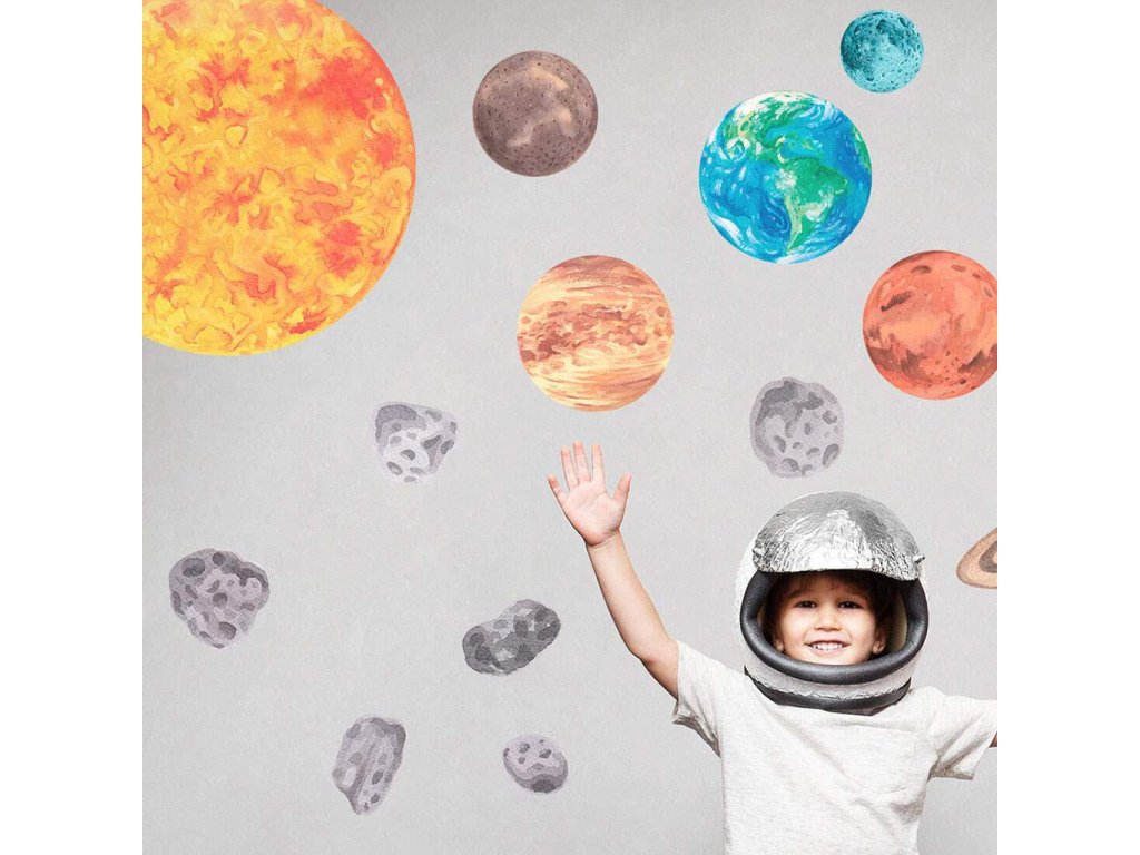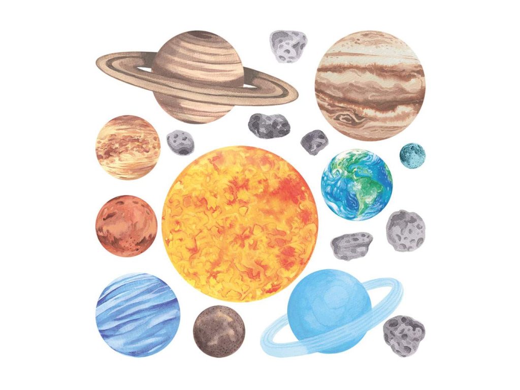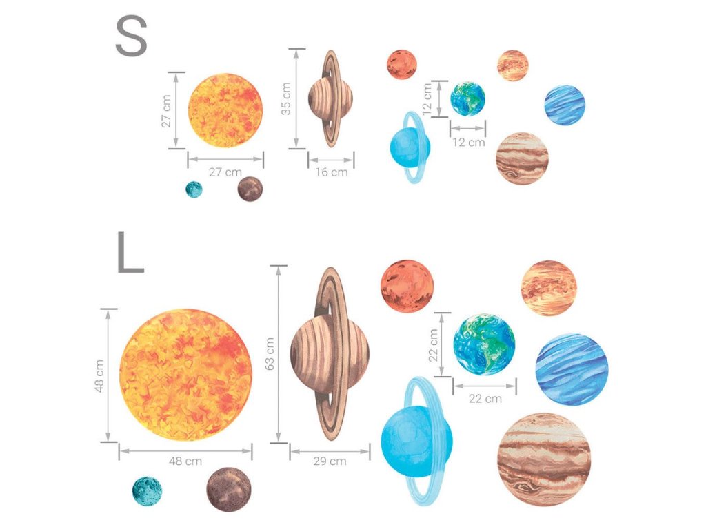 Krásna nálepka na stenu Slnečná sústava S. Samolepky slnečnej sústavy sú skvelým spôsobom, ako pridať do detskej izby nadpozemský vesmírny motív. Sada samolepiek obsahuje 8 planét: Merkúr, Venuša, Zem, Mars, Jupiter, Saturn, Urán a Neptún. Súprava tiež obsahuje slnko, mesiac a niekoľko asteroidov.Samolepka je zaistená špeciálnym matným laminátom, ktorý ju chráni pred poškriabaním pri každodennom používaní a zároveň uľahčuje lepenie – fólia je silnejšia a ľahšie sa prenáša na stenu.