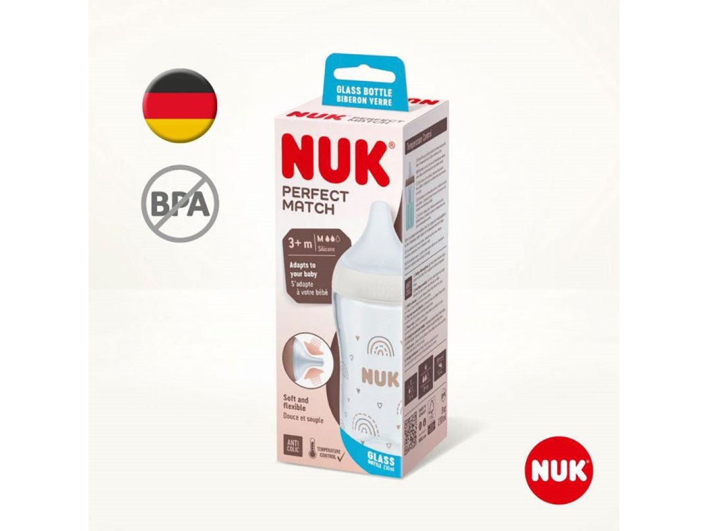 Sklenená dojčenská fľaša NUK Perfect Match s kontrolou teploty a mäkkým silikónovým cumlíkom. Špeciálny tvar typický pre cumlíky NUK s ortodontickým antikolikovým cumlíkom je modelovaný podľa materskej bradavky pri dojčení. Ponecháva dostatok priestoru pre prirodzené sacie pohyby jazyka aj čeľuste. Veľká, široká opora pier pri pití pripomína matkinu pokožku. Fľaštička je navrhnutá tak, aby bábätko neprišlo do kontaktu s pevnými plastovými časťami. Vylepšený systém proti prehĺtaniu vzduchu pri pití Anti Colic Air System zaisťuje prirodzený tok mlieka, aby dieťa pilo uvoľnene bez prehĺtania vzduchu. Hladko sa zužujúci tvar s antikolikovou funkciou pre plynulý a nerušený prietok pitia, veľkosť M (od 3 m, pre materské mlieko). Dojčenské fľaše sú teraz vybavené novou NUK kontrolkou teploty a pomáhajú tak zabrániť tomu, aby vaše dieťa pilo príliš horúci príkrm. Kontrolka vyzerá ako teplomer, je umiestnená medzi ryskami a teplota obsahu fľaše zmení jej farbu. Pokiaľ je príkrm príliš horúci, modrá kontrolka sa zmení na bielu. V ideálnom prípade by mal príkrm mať telesnú teplotu (37 °C), čo zodpovedá modrému zafarbeniu displeja. Vyrobená z vysoko kvalitného skla a neobsahuje BPA (Bisfenol A). Obsah fľaše 230 ml. Vhodná pre deti od 3 mesiacov, M od 3 m pre materské mlieko). Klinicky testované.Charekteristika: