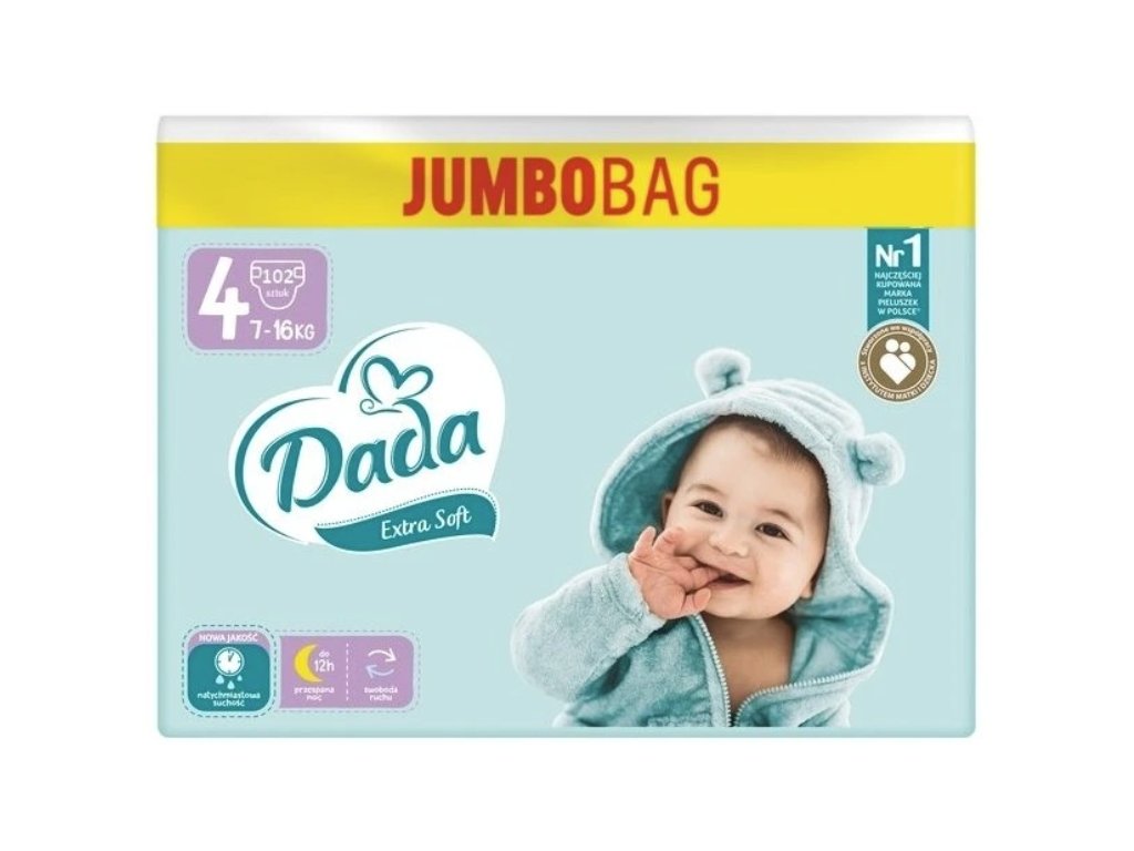 Dáda plienky extra soft 4 MAXI určené pre deti s hmotnosťou medzi 7-16 kg sú perfektné a poskytujú až 12 hodinové pohodlie - ako pre tých najmenších, tak pre rodičov. Pridanie vitamínu E chráni pokožku. Trojitý, široký elastický suchý zips sa dá ľahko pripevniť. Plienky Extra soft sú oproti plienkam Extra Care tenšie ale nemusíte sa báť, že by niekedy pretiekli. Výrobca ich odporúča na nosenie cez deň.