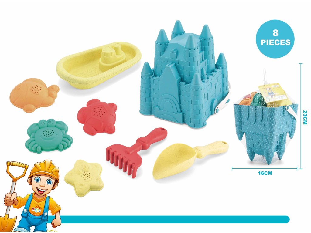 Súprava na piesok 8 ks. Rozmery 16x23 cm. Obsahuje vedierko hrad, lopatka, hrabličky, loď, 4 formičky.Dodatočné parametre