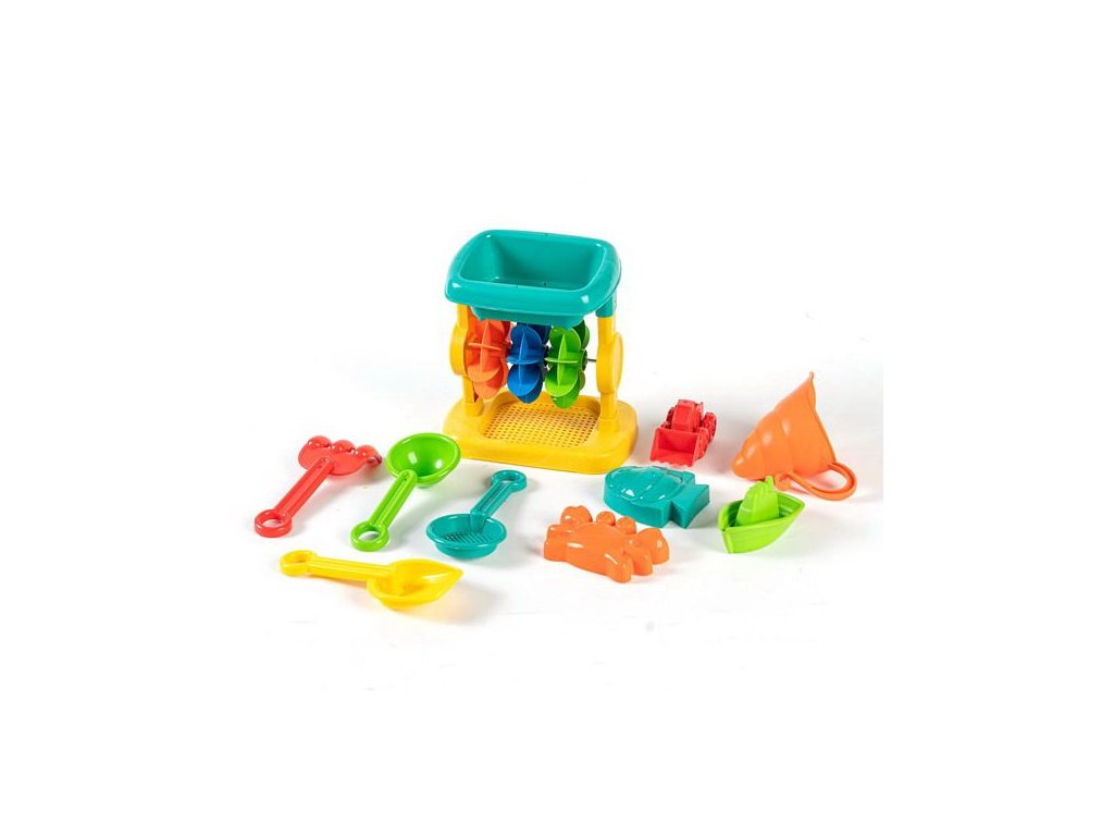 Súprava na piesok mlynček 10 ks. Rozmery 17x11x23 cm. Súčasťou mlynček, 2 lopatky, hrabličky, sitko, formičky.Dodatočné parametre
