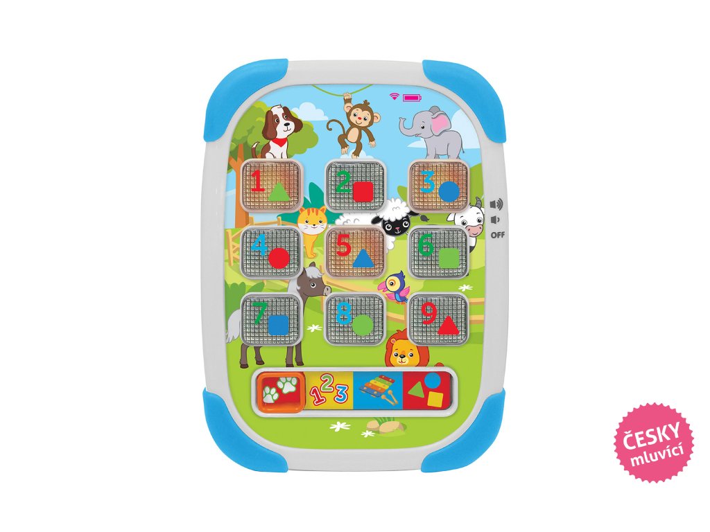 Tablet detský - hovorí po česky. Rozmery 14,5x20 cm. Svetelné a zvukové efekty. 3xAAA batérie súčasťou. Prepínač na pravom boku - vypnuté, nižšia, vyššia hlasitosť. 4 módy posunom oranžového štvorca a následné stlačenie čísel - 1. výučba zvieratiek, 2. výučba čísel, 3. zvuky xylofónu a melódie, 4. výučba farieb a tvarov.Dodatočné parametre