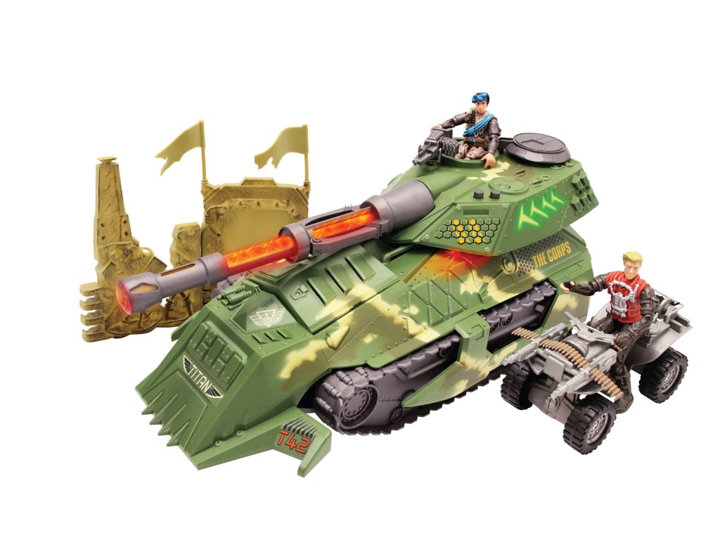 The Corps tank Titan s vojakmi. Veľkosť tanku 39 cm, vojaka 10 cm. Svetelné a zvukové efekty. 10 rôznych zvukov. 3xAA batérie súčasťou. Obsahuje tank, štvorkolku, 2 vojakov, barikády.Dodatočné parametre