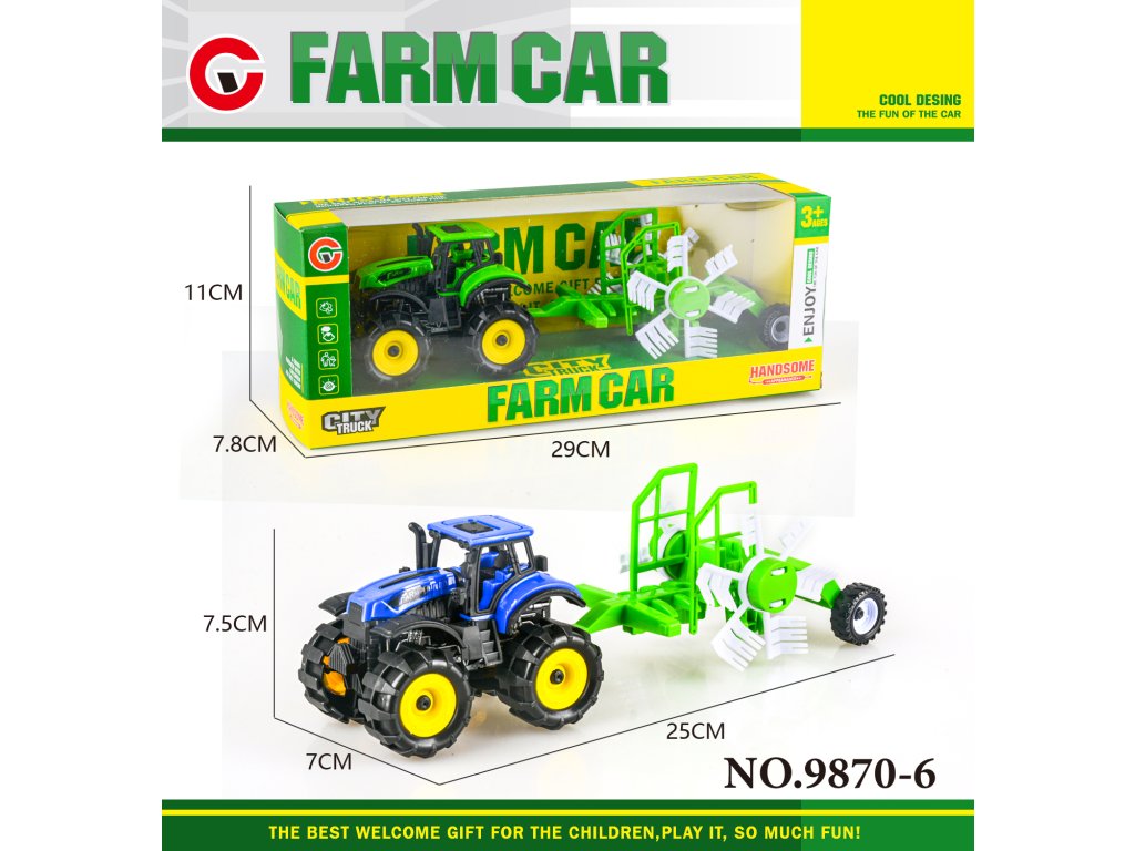 Traktor na zotrvačník s prívesom. Rozmery traktora 25x7x7,5 cm. 2 varianty - modrá, zelená.Dodatočné parametre