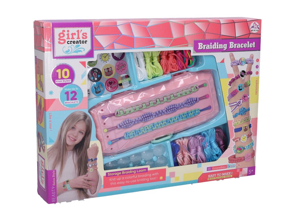 Tvorba náramkov set. Obsahuje krabičku na zaháknutie náramku pri pletení a na uloženie potrieb na tvorbu náramku, ozdoby, nálepky, návod, povrázky na tvorbu náramkov. Veľkosť krabičky 23cm. Zo sady je možné vyrobiť až 12 náramkov. Návod obsahuje 10 štýlov pletenia.Dodatočné parametre