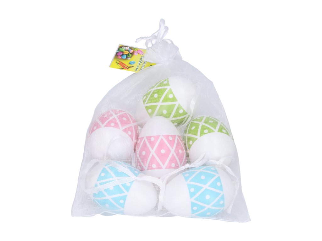 Vajíčko dekoračné plastové farebné o veľkosti 4x6 cm. 6 ks v organza sáčku.