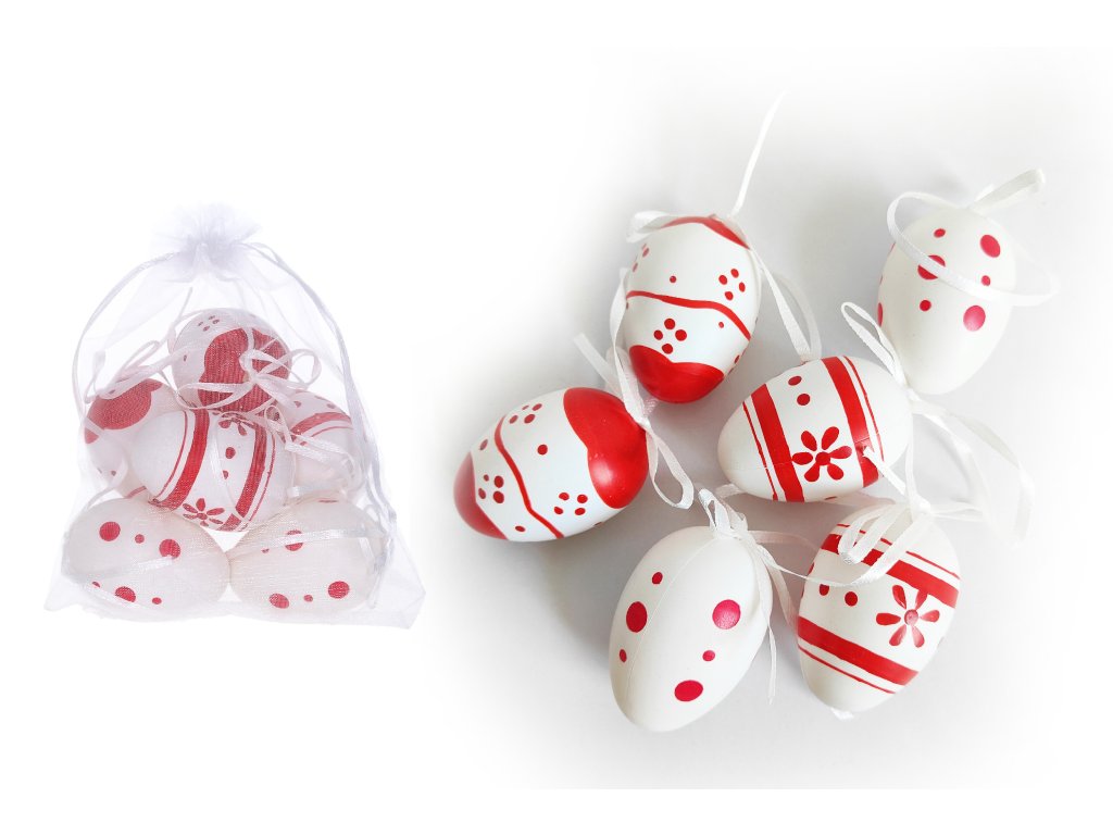 Vajíčko dekoračné plastové maľované o veľkosti 6 cm. 6ks v organza sáčku. Cena za jeden organza sáčok.Dodatočné parametre