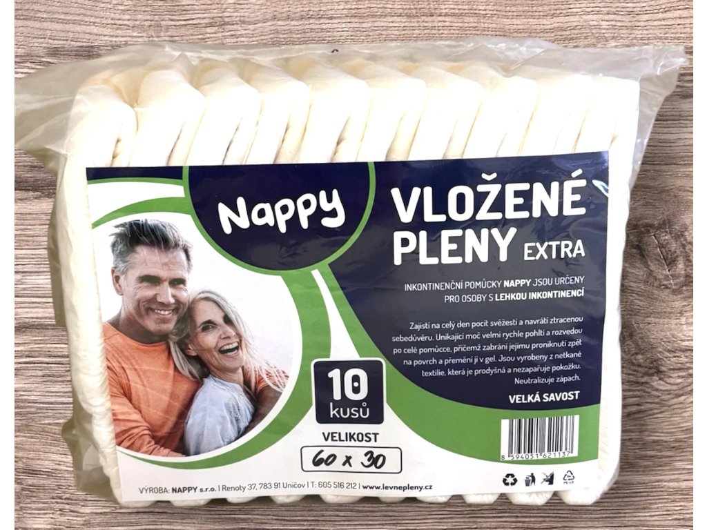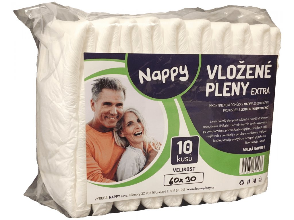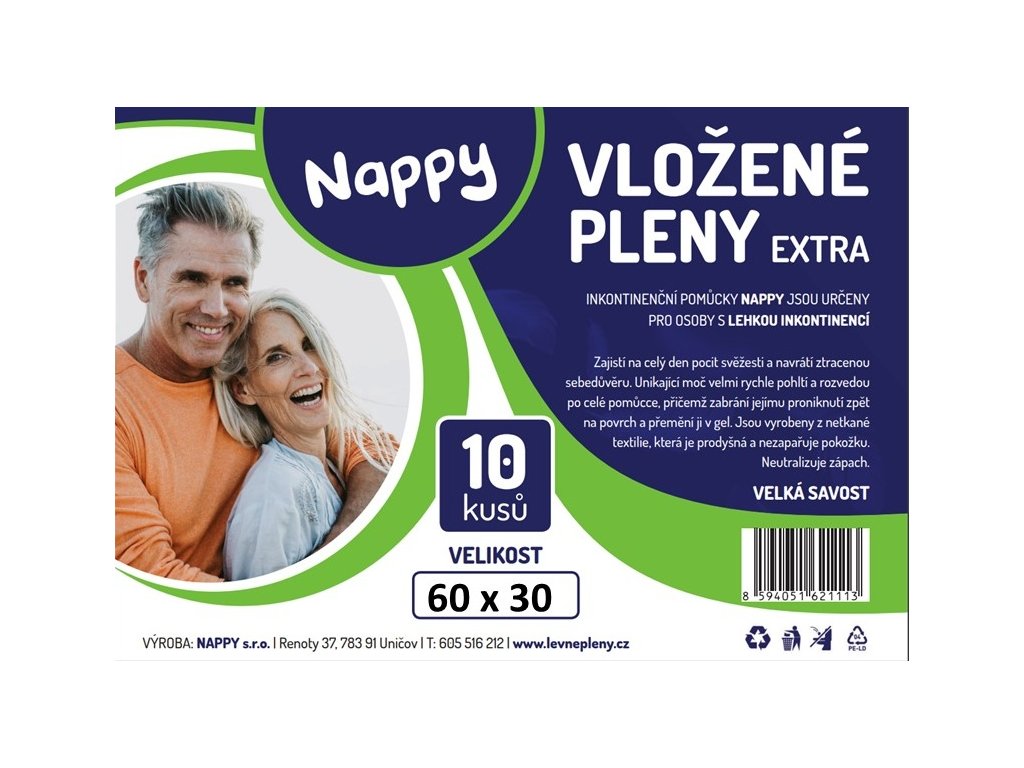 Pod našou značkou NAPPY nájdete kvalitné prebalené vložné plienky určené prevažne pre západný trh. Jedná sa o vložné plienky s priedušným antibakteriálnym povrchom jemné ako bavlna brániaca zapareninám, vhodné pre citlivú pokožku. Sú anatomicky tvarované zaručujúce pohodlné nosenie a bezpečie. Majú vodoodpudivé pružné postranné manžetky, superabsorpčné savé gélové jadro rýchlo pohlcujúce unikajúci moč a neutralizujúce nežiaduce zápach. Vhodné pre mužov aj ženy. V balení môže byť zakaždým výrobok iného výrobcu, ale vždy sa jedná o typovo rovnaký výrobok.