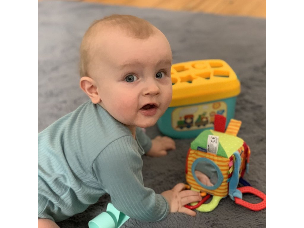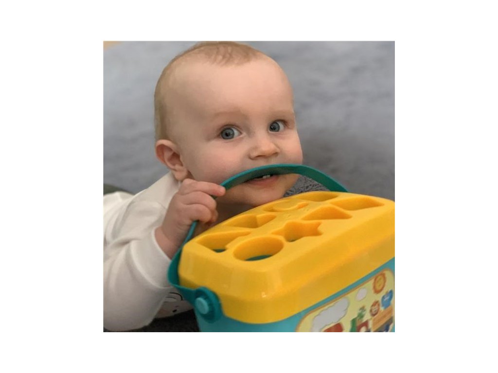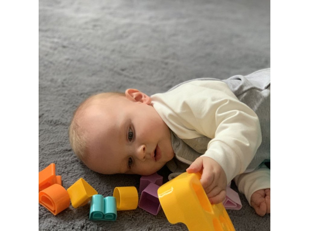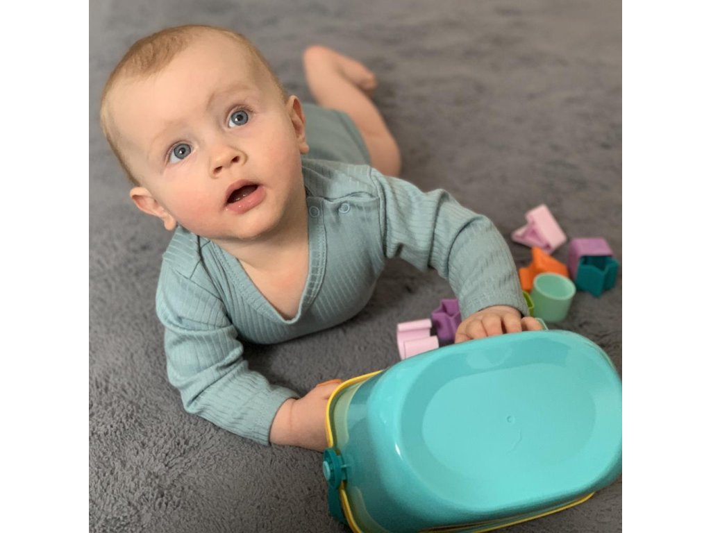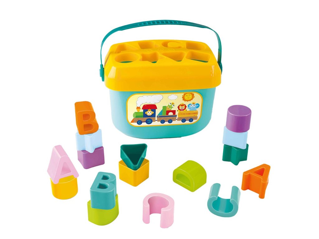 Na hornej strane vkladacieho vedierka Baby Mix je 8 rôznych otvorov, do ktorých je možné vložiť 16 rôznofarebných geometrických tvarov a písmeniek. Hračka rozvíja hmat, zrak a poznávacie schopnosti. Vedierko umožňuje pohodlné prenášanie.