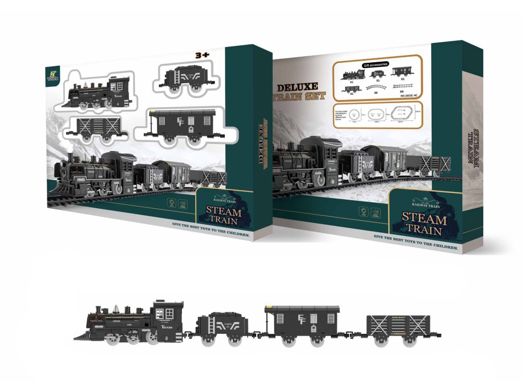 Vlak set. Rozmery železnice 135x75 cm, veľkosť mašinky 20 cm, vagónov 10-15 cm. Možnosť zložiť 3 rôzne trate. Svetelné, zvukové a dymové efekty. 4xAA batérie zo spodnej strany mašinky nie sú súčasťou. Prepínač ON/OFF na ľavom boku mašinky. Obsahuje, mašinku, 3 vagóny, 4 rovné koľajnice, 6 zahnutých koľajníc, nádobku na vodu. Nádržka na vodu pod strieborným komínčekom.Dodatočné parametre