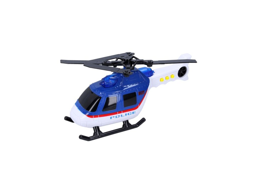 Vrtuľník polícia s efektmi. Veľkosť 18 cm. Svetelné a zvukové efekty, aktivácia tlačidlami na chvoste. Vrtuľou je možné voľne otáčať.
