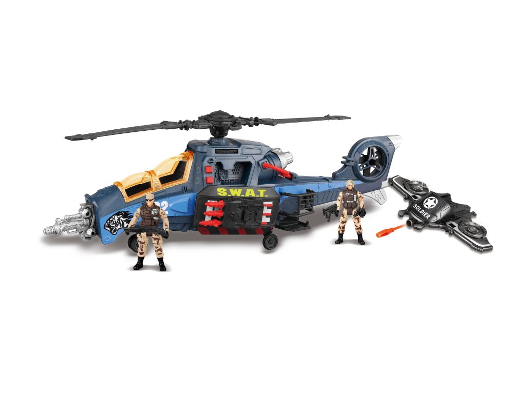 Vrtuľník s figúrkami a efektmi. Dron strieľajúce náboje. Veľkosť vrtuľníka 60 cm, vojakov 10 cm. Svetelné a zvukové efekty tlačidlami na ľavom boku vrtuľníka. 2xAA batérie do vrtuľníka nie sú súčasťou. Obsah - vrtuľník, dron, náboje, zbrane, 2 figúrky vojakov. Obrázkový návod na používanie na zadnej strane obalu.Dodatočné parametre