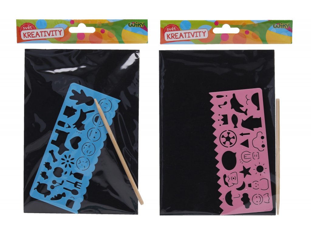Vyškrabávacie plátno o veľkosti 14,5 x20 cm + šablóna + ceruzka. 4 rôzne farby šablóny.Dodatočné parametre