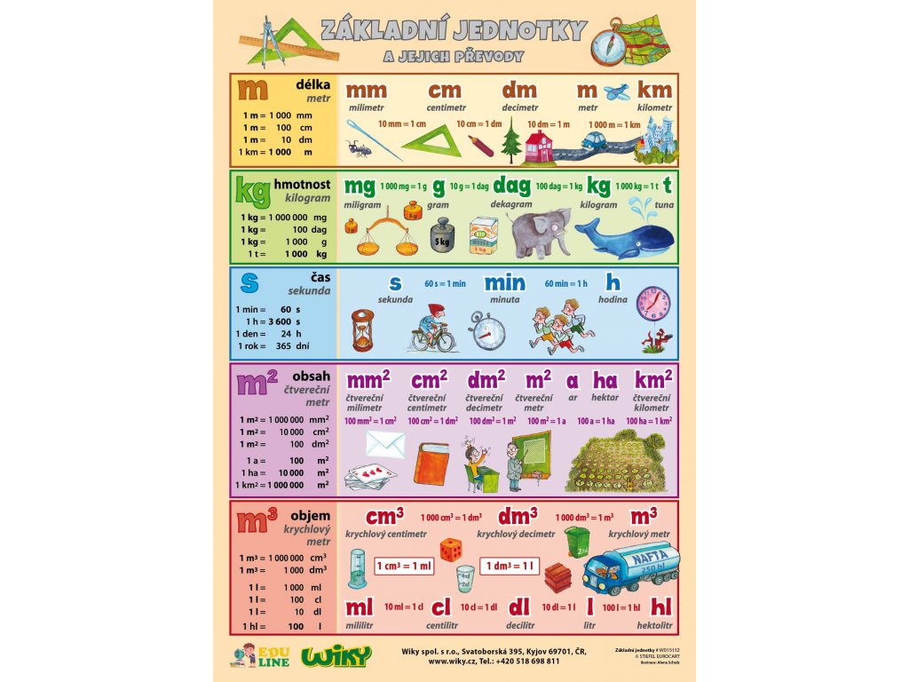 Obsah prednej strany tvoria jednotky dĺžky, hmotnosti, času, obsahu a objemu, s prevodmi jednotiek as názornými ilustráciami. Ilustrácie sú zvolené čo najtypickejšie, aby viedli k ich ľahkému zapamätaniu a tiež umožňovali vykonávať odhad dĺžky, vzdialenosti, hmotnosti, času, obsahu a objemu. Zadná strana je zhodná v ilustráciách s prednou a slúži na precvičovanie.Dodatočné parametre