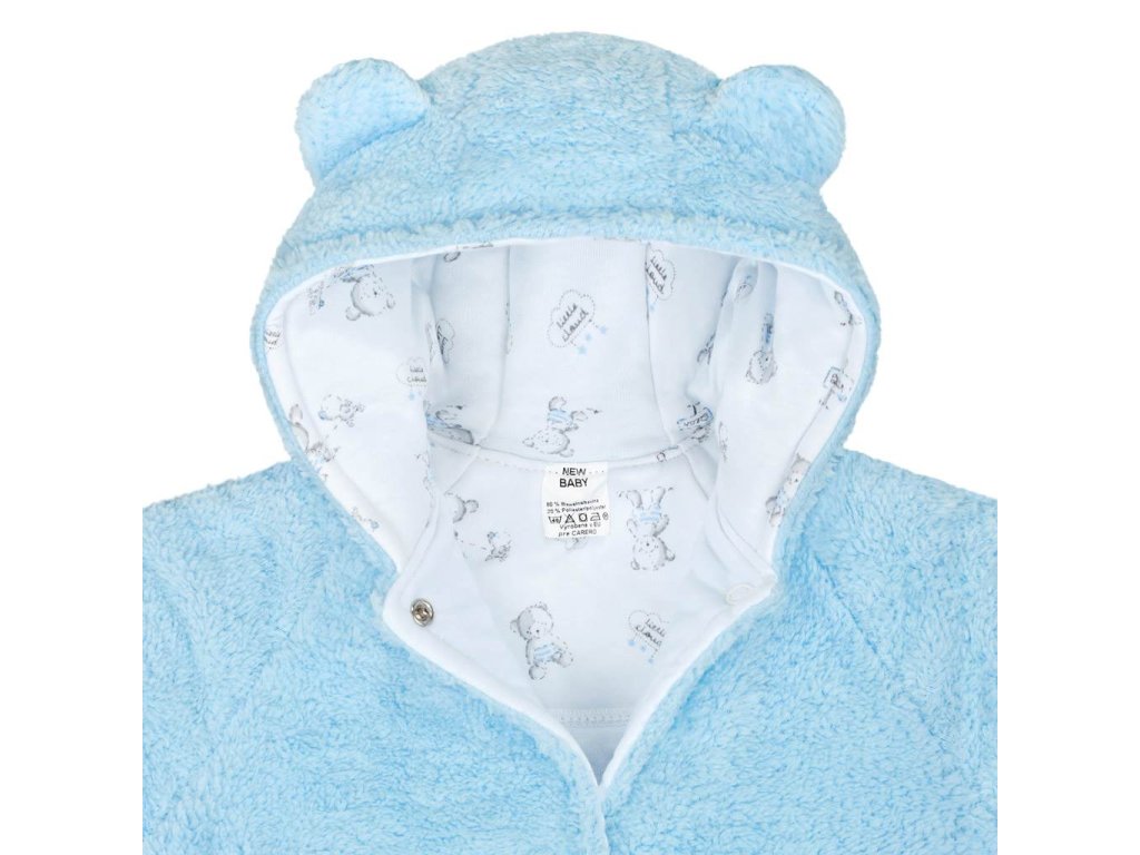 Zimný dojčenský kabátik s kapuckou New Baby Nice Bea. Zimný kabátik je vyrobený z dvoch vrstiev kvalitného materiálu - vrchného hrubšieho, hrejivého fleecového materiálu a spodnej bavlnenej podšívky, ktorá je celopotlačená medvedíkmi. Kabátik zdobí obrázok medvedíka a má praktickú kapucňu s roztomilými uškami. Zapínanie na cvočky po celej dĺžke. Zloženie: vrchná vrstva 80% bavlna, 20% polyester, podšívka: 100% bavlna, výplň: antialergické vlákno.Dodatočné parametre