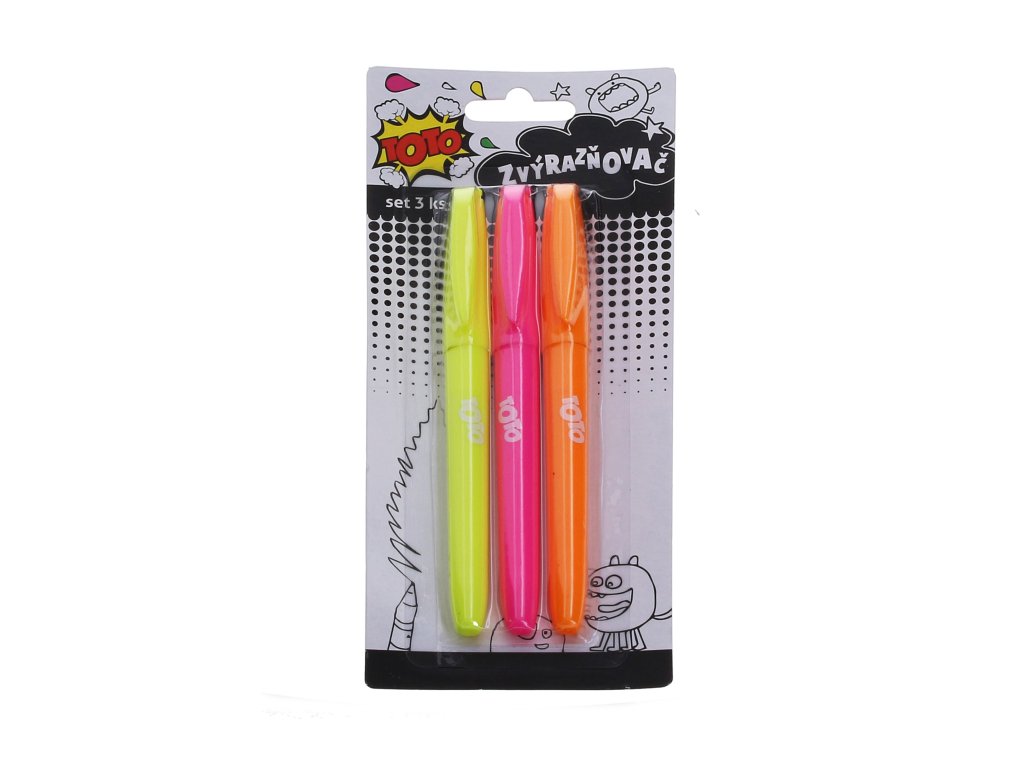 Zvýrazňovače 3ks • Klinový hrot (3mm) • Veľkosť zvýrazňovača 13,5cm • 3 farby (žltá, ružová, oranžová)Dodatočné parametre